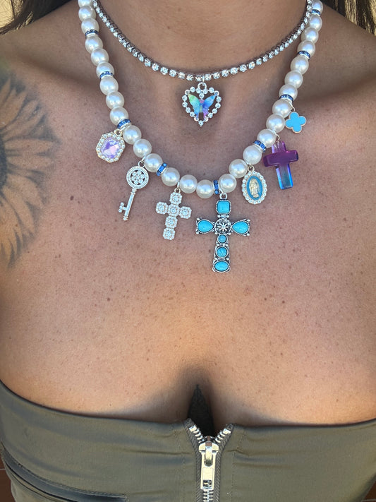 Set 2 collane: catena argento con charms e collarino a retina nero
